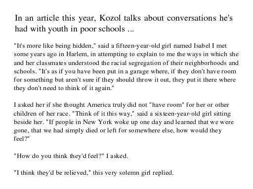 From “Still Separate, Still Unequal: America's Educational Apartheid” by Jonathan Kozol in Harper's Magazine v.311, n.1864 1sep2005
